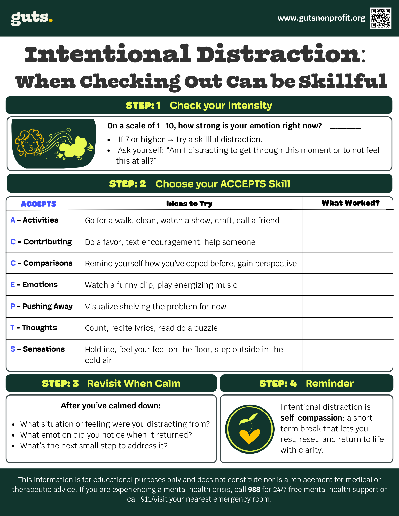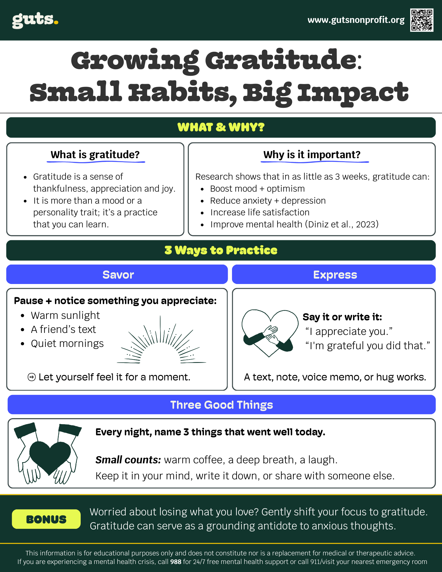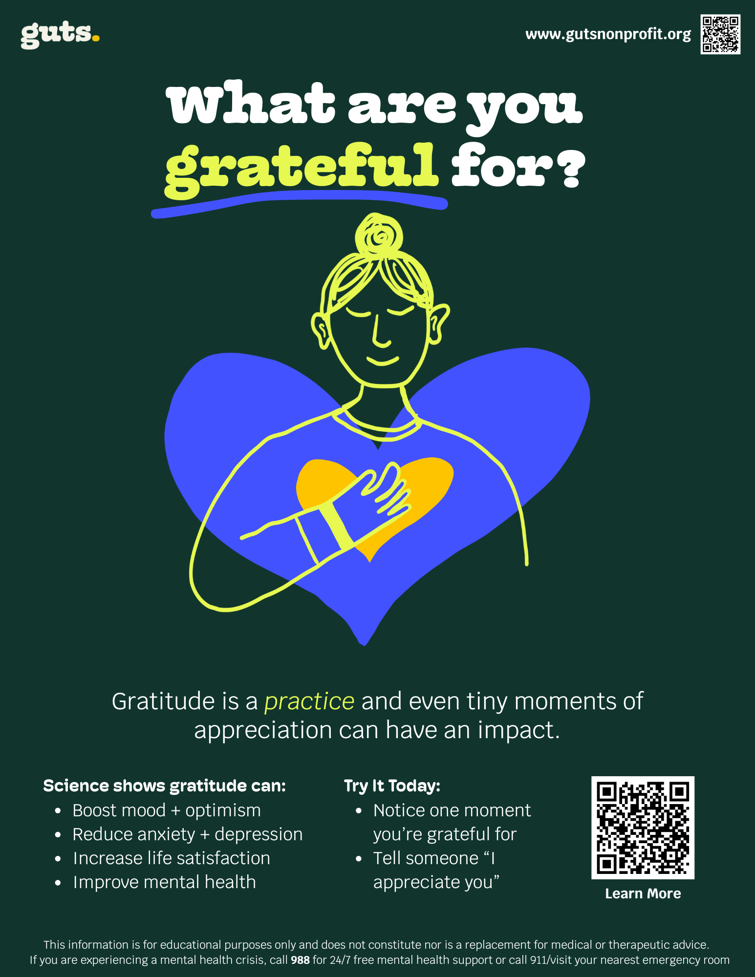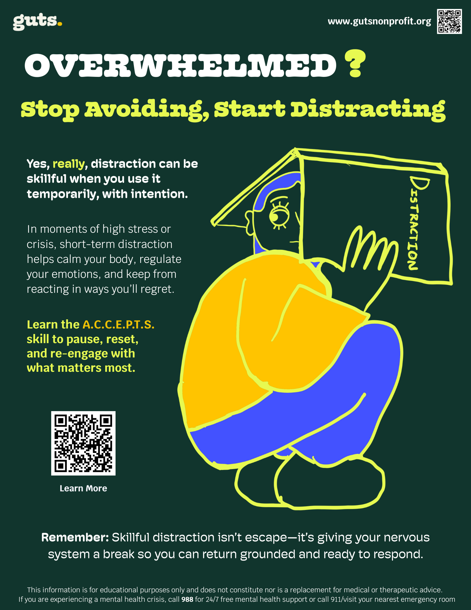 One of our core goals is to get evidence-based mental health tools to the community for free. These visuals are designed to help you follow along, practice, and put strategy into action. Each set (flyer, infographic, & worksheet) is paired with an episode of our Spill Your Guts podcast. Download, share, or print these infographics to hang at work, in classrooms, or anywhere in your community so more people can find support when they need it.